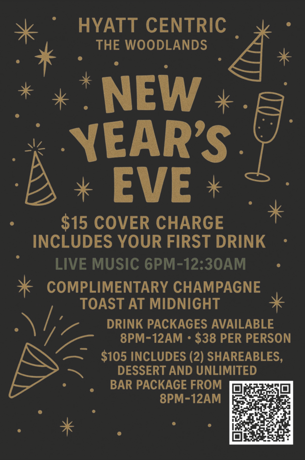 Ring in the New Year in style at Hyatt Centric The Woodlands! Join us for an unforgettable evening filled with live music, festive vibes, and sparkling celebrations.