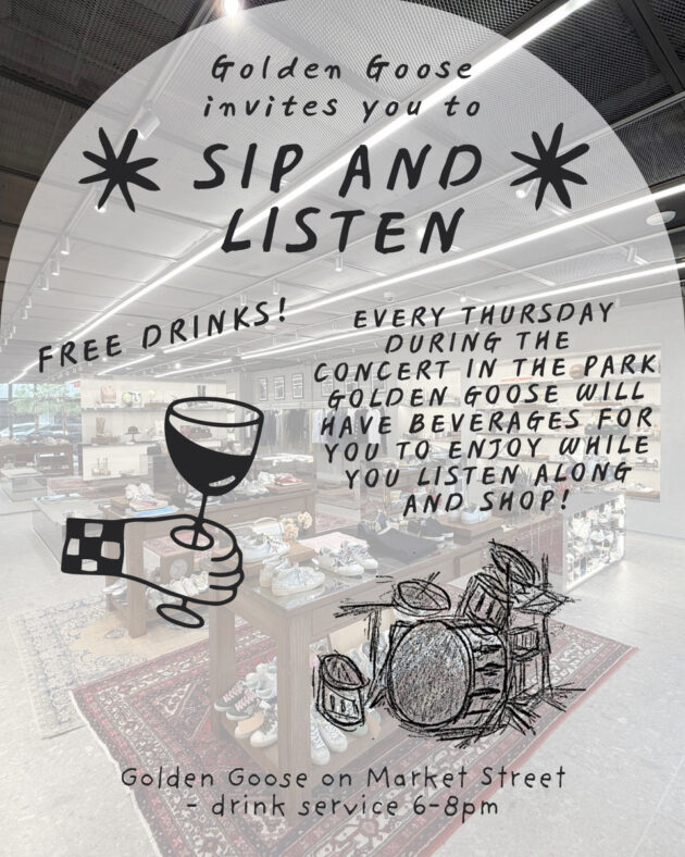 Every Thursday during the concert in the park golden goose will have FREE beverages for you to enjoy while you listen along and shop!